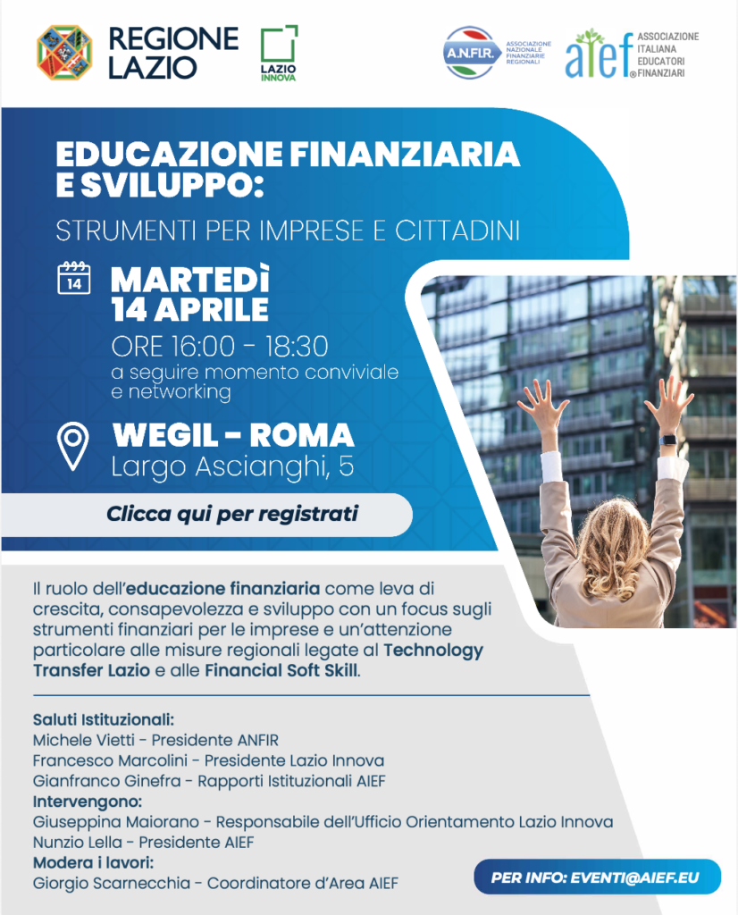 Promosso da Lazio Innova, ANFIR e AIEF, l’evento riunirà istituzioni e operatori del settore per approfondire il ruolo delle competenze finanziarie e degli strumenti a supporto di imprese e cittadini in un contesto economico in continua evoluzione.
